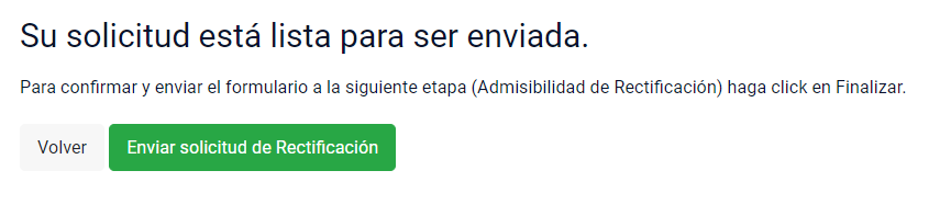 En este paso, tu solicitud se encontrará lista para ser enviada al Servicio Nacional de Migraciones. Presione Enviar solicitud de Rectificación para completar el trámite.