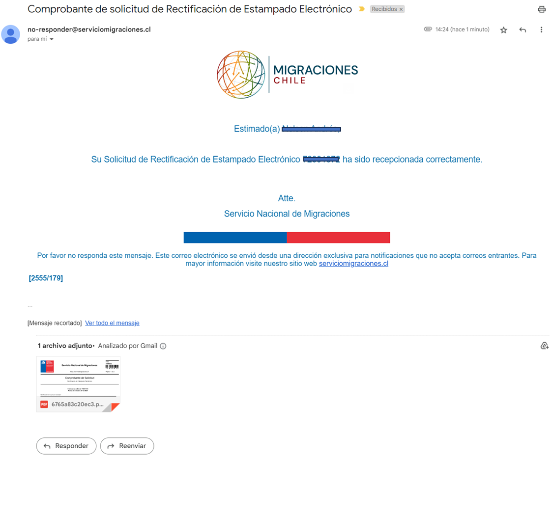 Mediante un correo electrónico se notificará que la solicitud de Rectificación de Residencia Temporal Otorgada ha sido recibida.